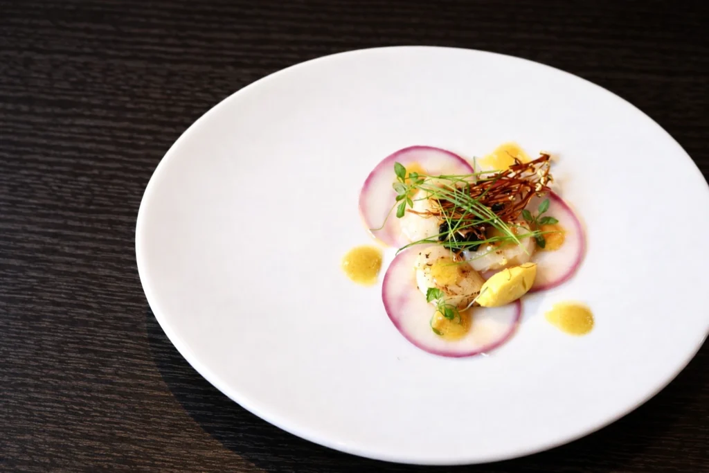 帆立と桃カブのカルパッチョ 柿のビネグレット