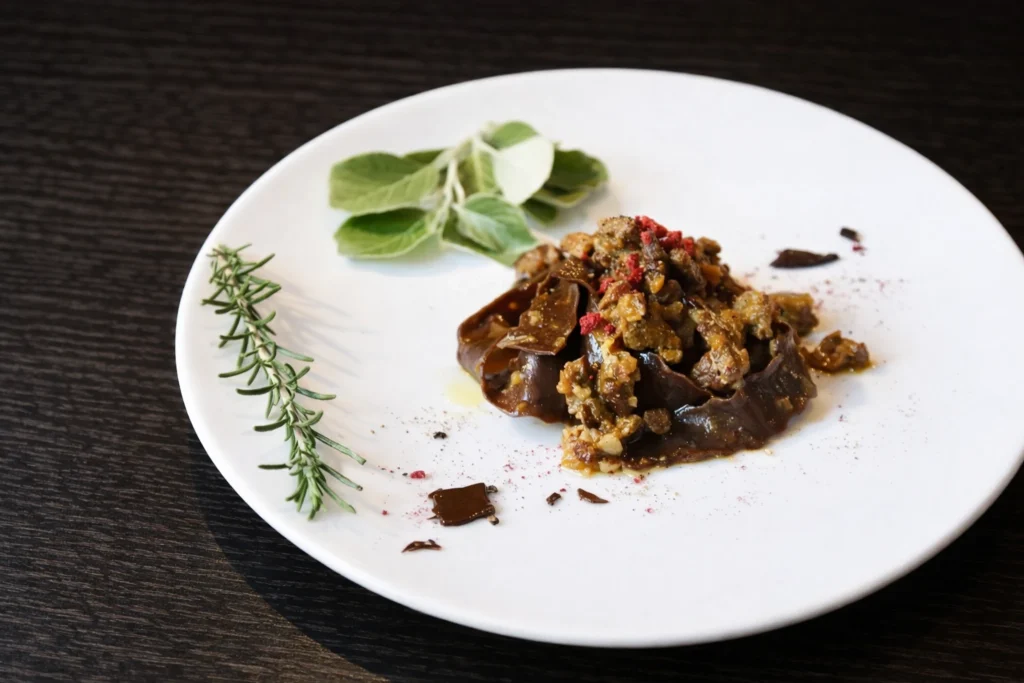 カカオを練り込んだ香り豊かなパッパルデッレに、岩手県産合鴨の旨味をじっくり引き出したラグーソースを合わせた一皿。