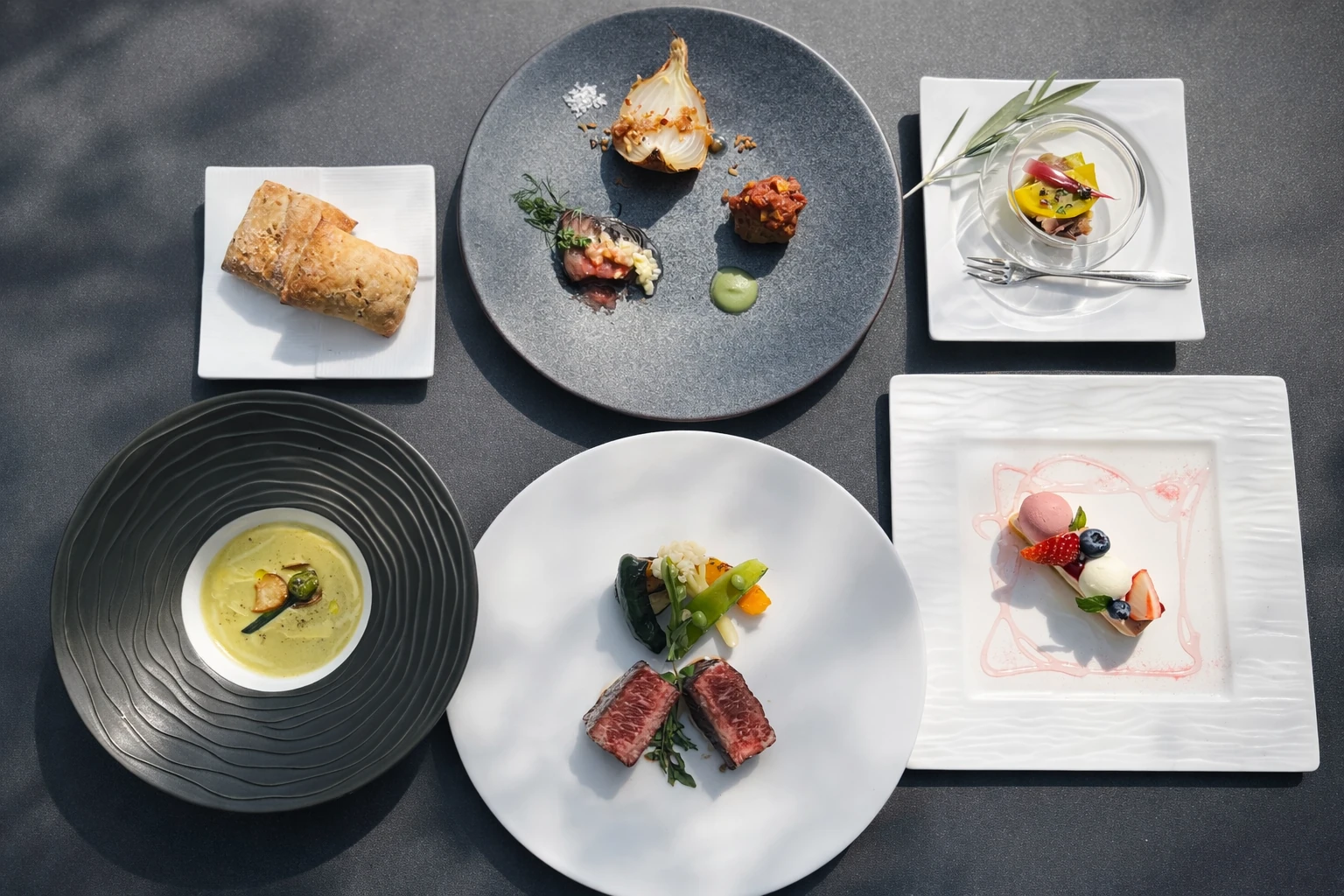 | Amuse 旬のアミューズ Appetizer 春の食材の前菜3種盛り合わせ Soup 農園野菜のポタージュ Main(チョイス) ~薪火グリル~ USDAPrime ブラックアンガス牛 サーロイン 100g USDAPrime ブラックアンガス牛 リブアイ 180g +1200円 USDAPrime ブラックアンガス牛 フィレミニョン 100g +1500円 A5ランク飛騨牛イチボ 100g +3000円 ~魚料理~ 本日の魚料理 ~パスタ~ 季節のパスタ ※上記メインの内容は都度変更致します。 Dessert アシェット・デセール カフェ 小菓子 【Pairing Drink menu】ペアリング付きのみ YOI LABO ノンアルコールティーを中心とした3杯 一例 テンチャノウマミ ポワールレモングラス カカオジンダージリン等 ※Main料理はパスタ・お魚・お肉から1品お選びください。 2026年4月29日〜2026年5月5日期間限定 料金 コースお1人様 5,500円(税込)コース+ペアリング付き7,500円(税込) |