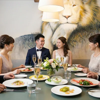 | 15,000円 / お一人様 ※ コース内容・人数により変動いたします。 〈コース料理〉 ー全6品ー ・本日のアミューズ ・シュリンプカクテル ・自家製コンソメスープ ・本日のお魚料理 ・ブラックアンガス牛 フィレ ・本日のデザート ・パン・カフェ・小菓子 ※お子さま向けメニュー対応可(年齢・ご希望に応じて) ※進行・タイミングの事前相談 ※内容は人数・ご希望に応じて調整可能です。 〈含まれるもの〉 ・コース料理 ・メッセージ入りデザートプレート |